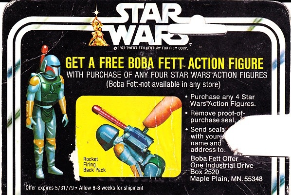 The very first figure promotion offered on cards was for the bounty hunter Boba Fett. He was first seen in the dreadful holiday special, in a cartoon during the show, and was also rumored to have a big role in The Empire Strikes Back.