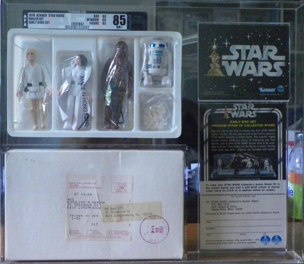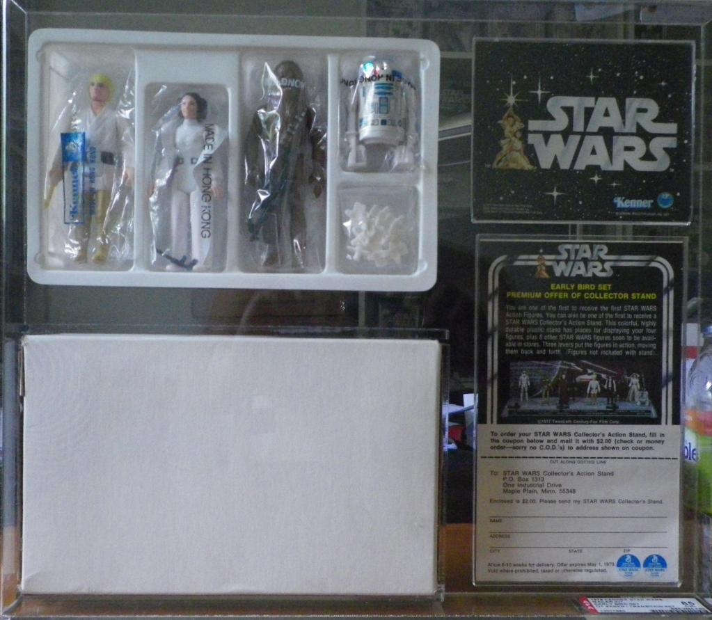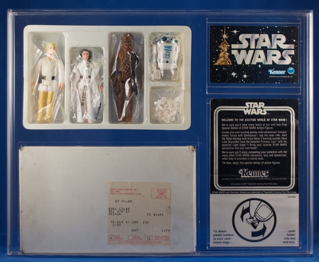 Mailer Box, Plastic Tray, Plastic Pegs in heat sealed blank baggie, regular non DT Luke in SW-A, SW-B, or SW-C baggie, Display Stand coupon, Large SW catalog with star field (shown)