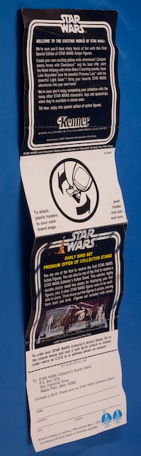 Starting in late January/early February of 1978, kids started receiving their belated Christmas presents in the mail which included: 4 figures, pegs for the cardboard stand, instructions for the pegs which included an offer for a plastic stand, and a mini catalogue showcasing other Star Wars product. Depending on when they sent off their mail-in certificate, there are slight variations in what they received. The variations include: baggie types, the insert catalog, and most importantly wether or not they received a Luke with the infamous double telescoping(DT) lightsaber.
